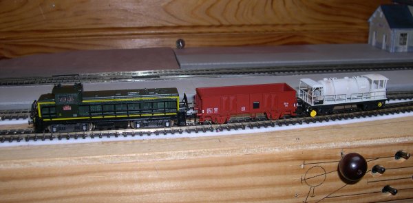 BB63000 Roco, tombereau Arnold et wagon désherbeur 'maison' |