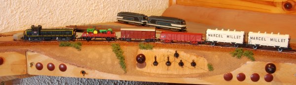 par la coulisse. Il est est alimenté d'une façon indépendante par l'alimentation du module céréalier. On peut ainsi manoeuvrer sur le plateau ou sur le module céréalier tout en faisant évoluer en même temps les convois sur le reste du réseau. |