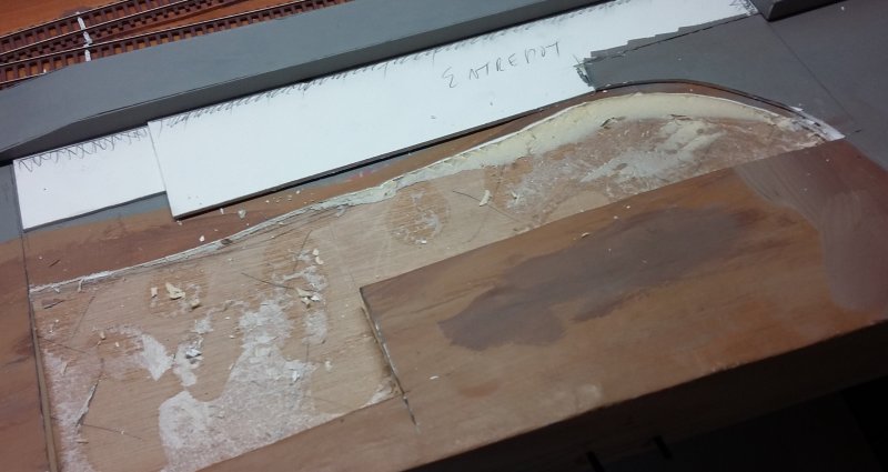 Début de la pose du nouveau plan de voie Les rails sont coupés, il reste à faire le câblage électrique et à réaliser la commande de l'aiguille Il faudra ensuite revoir le relief pour l'intégration entre les deux modules adjacents |