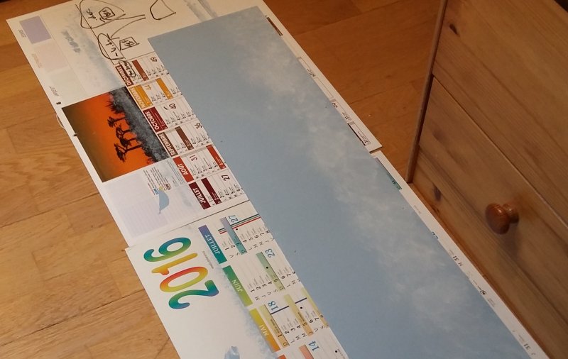 Deux couches de peinture acrylique bleue passées au rouleau Figuration des nuages à la peinture acrylique blanche à l'aide un morceau de mousse |