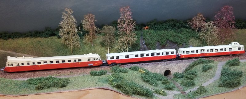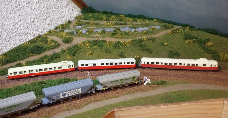 Un X3800 et un ABJ3 encadrant une remorque passent dans la vallée du Blavet