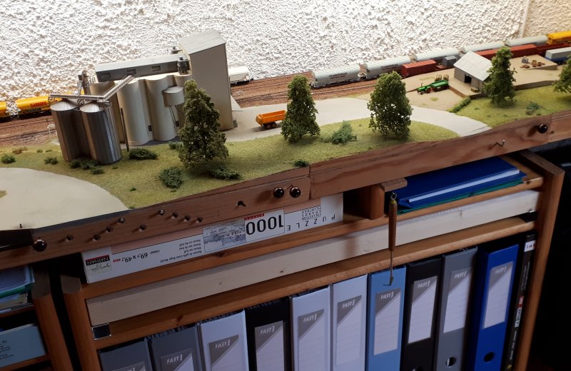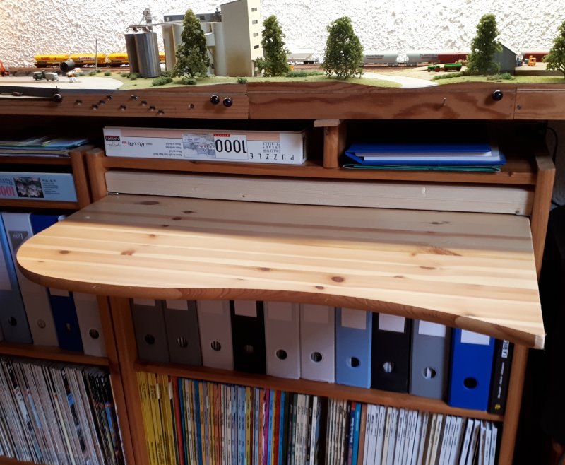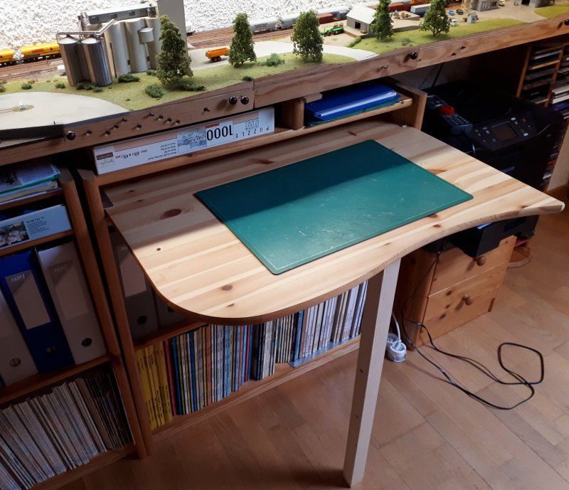 Un peu de menuiserie pour changer ! J'avais une table de cuisine qui me servait de bureau de bricolage devant le côté gauche du réseauCe n'était pas pratique pour jouer car son encombrement me gênait pour l'exploitation Néanmoins elle était bien pratique quand j'en avais besoin... |