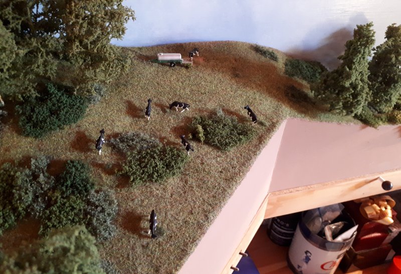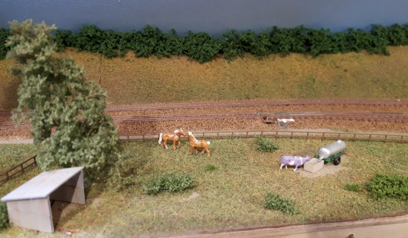 17 mars 2020. J'ai refondu le dessus du tunnel par un certain nombre d'opérations : dépoussiérage de l'herbe, remplacement des arbres et ajout de quelques autres, pose des fils sur les poteaux de cloture, ajout de végétation arbustive, pose d'un abreuvoire et d'une tonne à eau, et pour finir mise en place de quelques ruminants. Voilà, cette opération trainait depuis longtemps, maintenant c'est fait. |