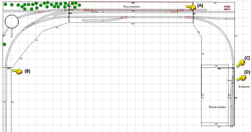 Voici le plan de la version 3 du réseau avec l'ajout des deux modules de la rue avec ses commerces (A) Pour insérer ces modules derrière la gare, cela m'oblige à raccourcir de 12cm le module de gauche (B), ainsi que celui de droite C) pour pouvoir reculer l'ensemble