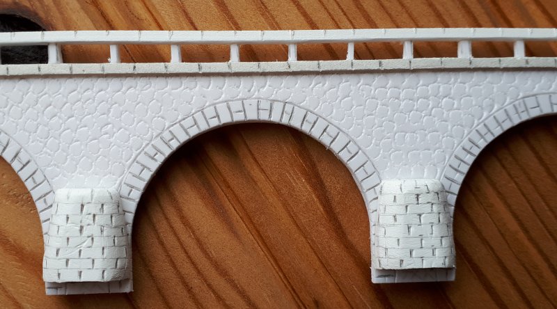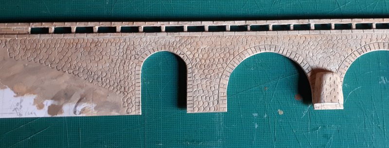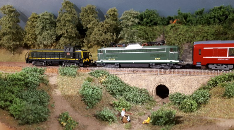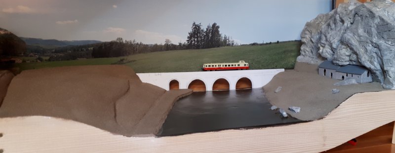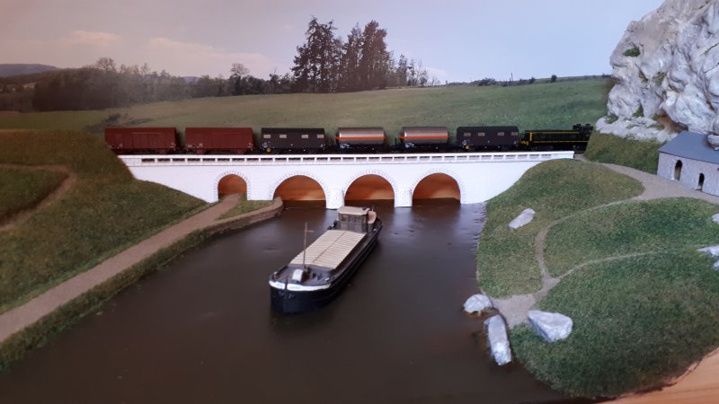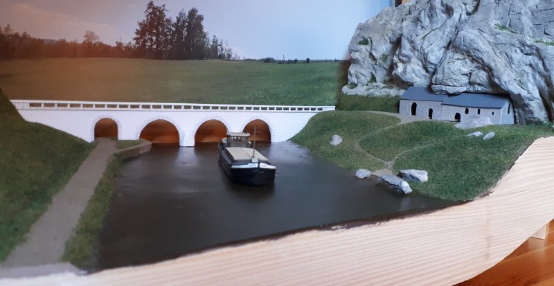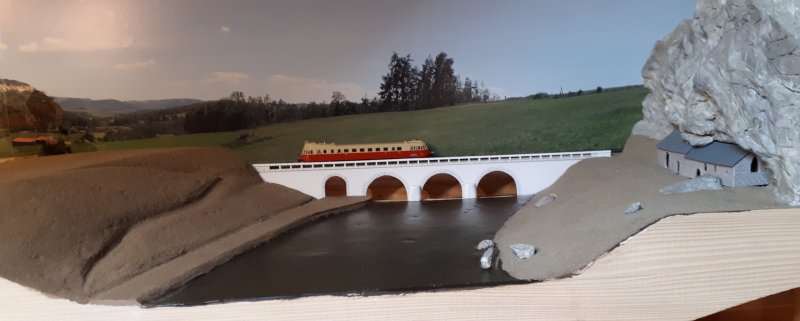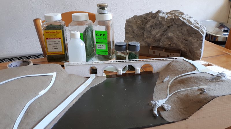 J'ai un peu lutté pour parvenir à trouver le bon compromis de la hauteur de l'eau par rapport au relief et au pont en tenant compte des impératifs liés à la réduction de l'échelle Finalement j'ai complètement refait la face avant du module qui ne correspondait plus au relief précédent |