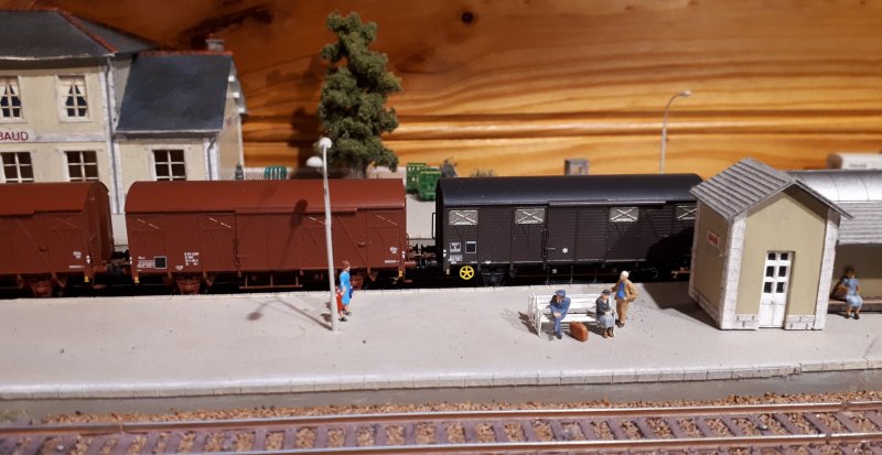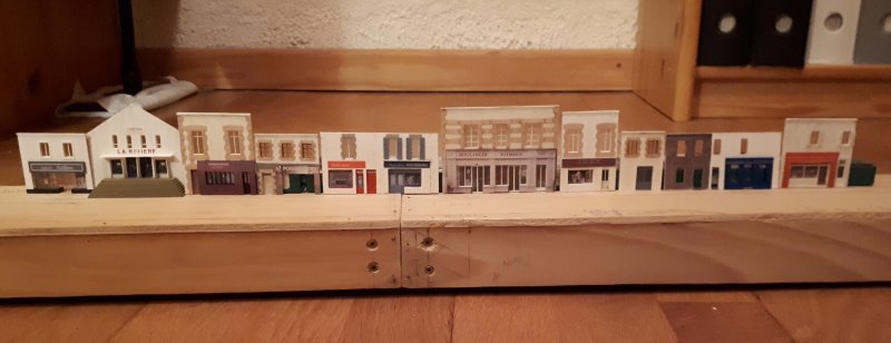 Ça rentre, je ne me suis pas trompé dans les dimensions en largeur ! Ces modules pour la rue vont me permettre - enfin - de figurer un vrai fond de décor pour masquer le lambris Avant de tout démonter, je vais m'avancer le plus possible sur le décor de ces nouveaux modules de façon à minimiser le temps d'intervention lorsque je les placerai derrière la gare |