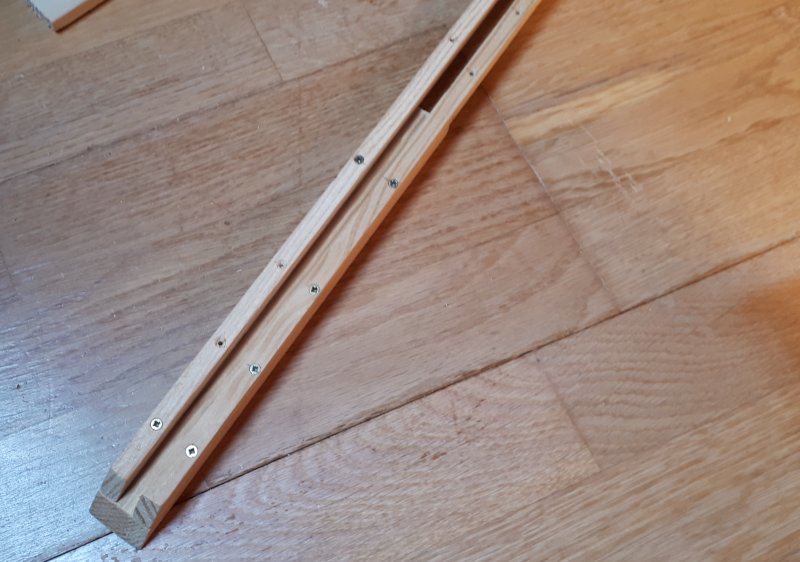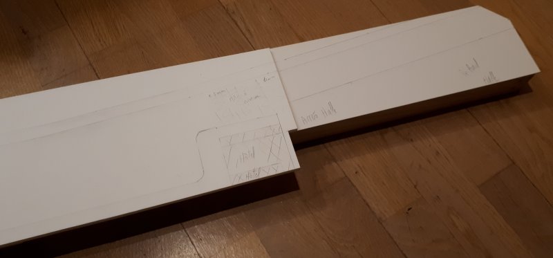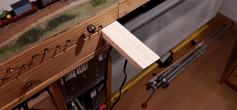 Allez, il faut s'y remettre un peu si je veux parvenir à faire ce que j'ai planifié pour cette année... Délimitation de la coupe pour l'ajout d'une aiguille sur le pont levis afin de préparer l'évitement derrière la penderie |