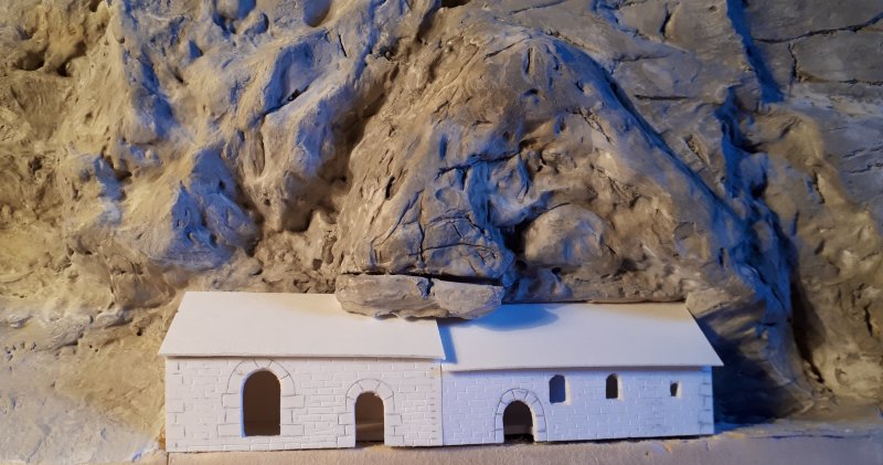 Mise en peinture de la chapelle avec une couche de 1/3 ocre (Pebeo 051), 2/3 cendre brune (Pebeo 070) et quelques gouttes de fiel de boeuf pour fixer la peinture acrylique sur le PVC Ensuite, passage de trois lavis de gris souris (Pebeo 054) En ce qui me concerne, j'ai toujours beaucoup de difficulté pour m'approcher de la teinte d'un objet réel pour le transposer en modèle réduit... Ceci étant, le rendu est bien meilleurs que ce qui apparait sur la photo |