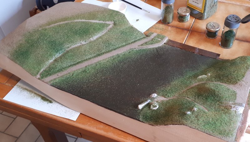 Après encollage des sols (50% colle à bois/50% eau), saupoudrage des différentes fibres de 3 mm et des mousses On retire les "caches" avant de laisser sécher l'ensemble Fibres GPP : vert printemps, vert prairie, vert fin été (fibres de 2 ou 3mm pour du N) |