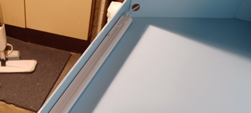 La norme est respectée en face avant avec un espace de transition de 150mm Ce n'est pas le cas à l'arrière mais c'est la façade qui a de l'importance Le bandeau d'éclairage de 80mm a lui aussi été posé |
