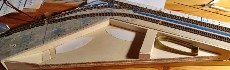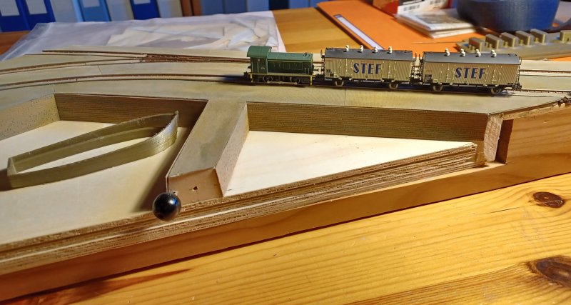 09/11/2025 Le port étant un micro-diorama amovible à lui tout seul, je l'ai désolidarisé du réseau pour pouvoir travailler dessus tranquillement sur un coin de table J'ai constaté sur les photos à ma disposition qu'en général les voies sur les ports sont assez proches des bords du quai Cette évolution du plan de voie ajoutera encore plus d'intérêt à l'exploitation au premier plan pour figurer les opérations de transbordement Avec un seul loctracteur il faudra bien s'organiser pour placer les wagons devant sur le quai, et derrière pour desservir les différentes entreprises |