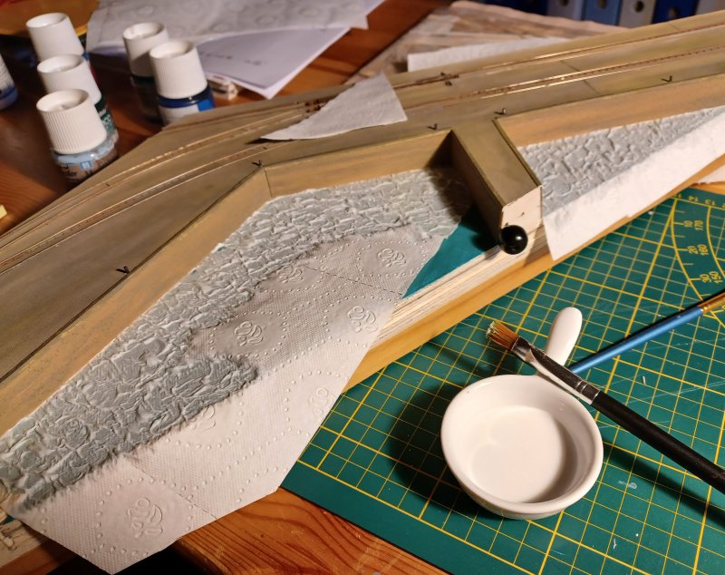 Essais de peinture, l'eau de mer est très difficile à reproduire On verra ça demain après séchage complet |