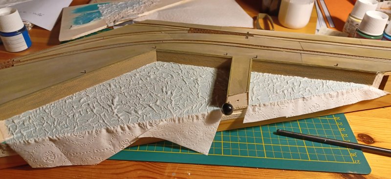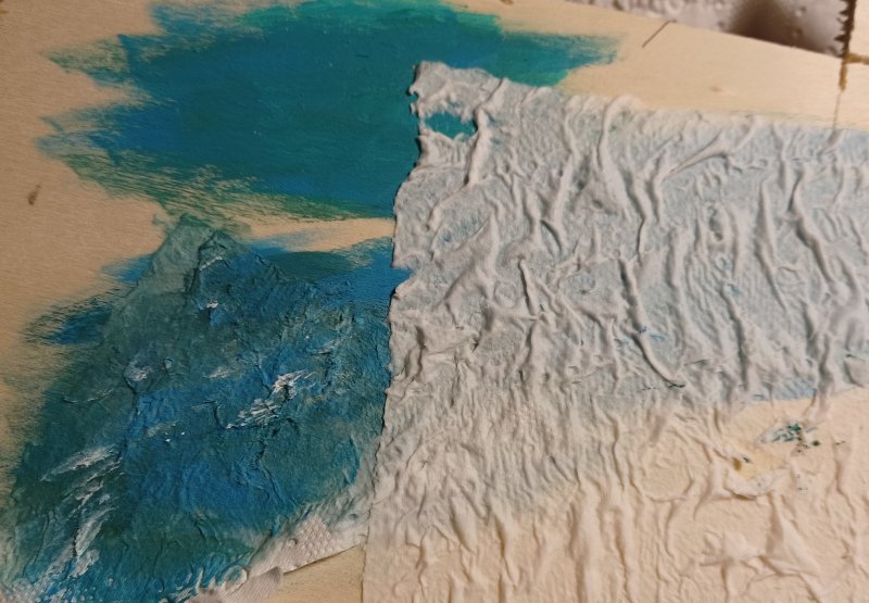 04/12/2025 Réalisation de la figuration de l'eau, avec du papier toilette, après avoir peint le support avec une sous couche de peinture acrylique Je me suis inspiré de ce tutoriel : https://www.youtube.com/watch?v=2TwpB7sVMn8 |